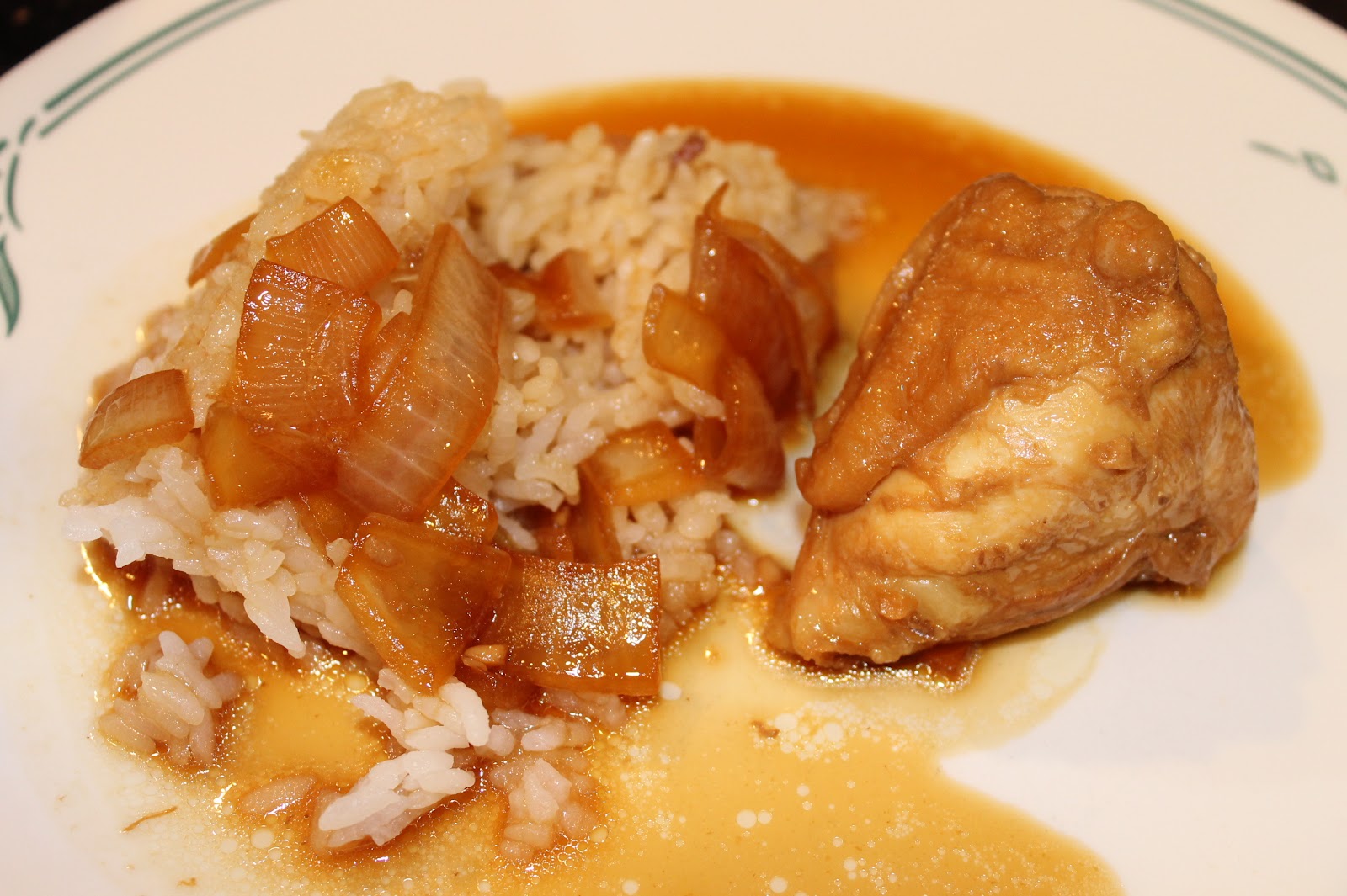 In mixing bowl or large measuring cup, combine soy sauce, vinegar, sugar and water. Set aside. In stock pot or dutch oven, heat to medium high, add sesame oil, then add chicken. Brown one side. Flip, then add garlic and continue to brown other side. Add onions, soy sauce mixture, peppercorns and bay leaves. Bring liquid to a boil, then reduce heat to simmer for a minimum of 15 minutes, or until onions begin to turn translucent. Serve with rice.