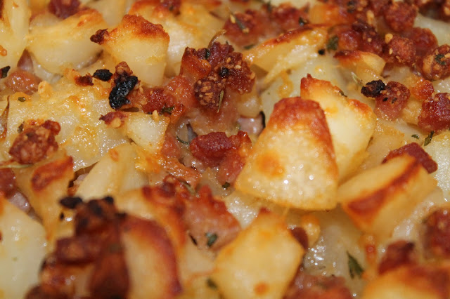 Here's a recipe I threw together out of desparation. We had just come back from vacation and things were still chaotic, but I was tired of take-out, so I whipped this recipe up so as to avoid ordering out yet again. An added bonus: even though the cooking time is not quick, I consider this to be one of my "easy" dishes, because the main part can be already prepared for you in the form of the diced fresh potatoes. (On this particular day, I used diced prosciutto that was also pre-packaged.) So prep time is at a minimum...but your house will smell so good as it bakes that your family will think you slaved over this dish! ;)